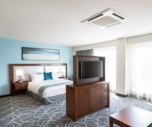 VRF’s small footprint and flexibility offered quick installation: “We had the system installed in 50 days.” Hampton explained that installation was made easier – and cheaper – because of the ability to go ductless. “With ductless cassettes, the hotel saw a savings of about $350 per unit. That’s by saving on things like labor for the installation, the ductwork itself and diffusers.” With 183 ductless cassette units installed, the hotel saved more than $64,000. Ceiling cassettes also enabled the guest room entryways to be three to four inches taller – making the rooms feel bigger.
