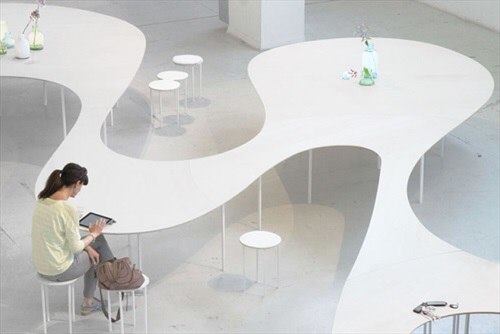 This particular concept of atmosphere is apparent in the Cloud Table (left) by Studio Maks, a Rotterdam, Netherlands–based firm founded by Marieke Kums, a protégé of Sejima and Nishizawa. Developed for this year’s Milan Design Week, the table encapsulates the geometric, material, and functional attributes of SANAA’s atmosphere concept. Configured as a single large, undulating surface supported by a forest of thin legs, the whimsical piece immediately invites user engagement. For additional functionality, the table also has discrete wireless charging pads and Wi-Fi signal boosters for mobile devices.