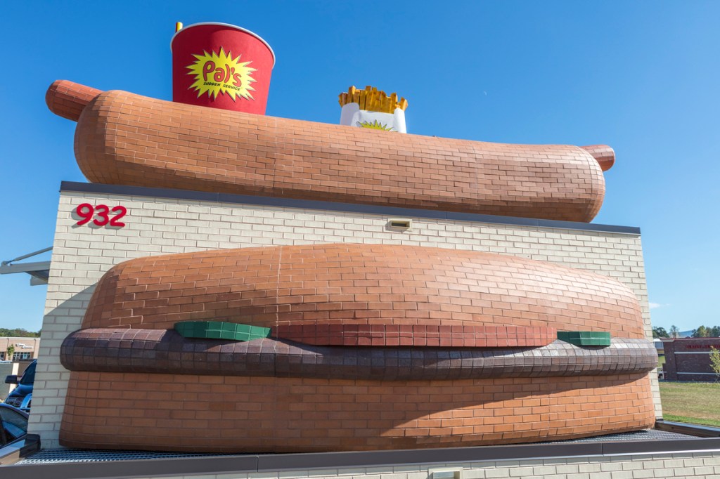 Pal’s Sudden Service, a Tennessee fast food chain, commissioned a larger-than-life tribute to its food: a hamburger, hot dog, fry, and soda-shaped restaurant made of brick. Weighing a total of 6,500 pounds, the unconventional structure in Johnson City is the product of city leaders’ reluctance to have the chain’s usual “giant, fiberglass hot dog and burger atop the vibrant, blue-painted block building,” according to a press release by Pal’s. The alternative design, built entirely in brick masonry, is based on a napkin doodle by Andy Warhol contemporary Tony Barone, and created by Lincoln, Neb.–based artist Jay Tschetter of Images in Brick. “The giant hot dog and burger might be a little different, but the food and service will be the same that our customers have grown to know and love,” said Pal’s Sudden Service president and CEO, Thom Crosby, in the press statement. [Pal’s Sudden Service]