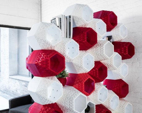 Supermod, a 3D-printed modular storage system (shown above) that doubles as a room divider, was designed by Brooklyn, N.Y.–based studio Simplus Design during a recent residency at Stratasys’ innovation workshop, Bold Machines, and was fabricated using MakerBot Z18 Printers. [Simplus Design]