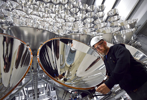 Synlight, an “artificial sun” made up of 149 xenon short-arc lamped spotlights, was turned on for the first time yesterday in Juelich, Germany, by scientists from the German Aerospace Center. The giant globular fixture can heat up to 5,432 F and is powered by a 350-kilowatt solar array. The project will test whether the energy of the actual sun can isolate hydrogen molecules. The aim is to split water molecules into hydrogen and oxygen atoms, in order to produce hydrogen fuel. [Associated Press]