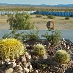A solar shade canopy wraps the roof and south and west sides of the residence and solar breezeway to provide protection against desert heat, glare, wind, and blowing dust.