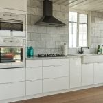 The floor in the kitchen (and throughout) is made from recycled Philippine mahogany plywood that can be easily sanded down and refinished.