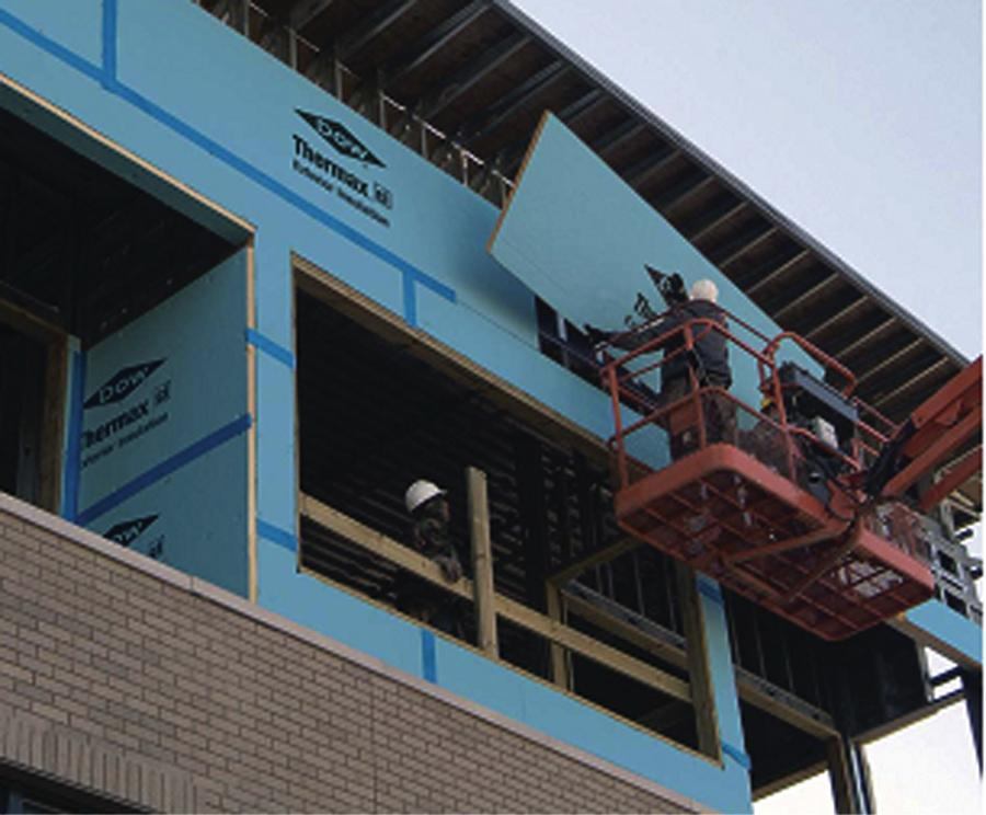 Dow Building Solutions has introduced the THERMAX Wall System for use on commercial steel-stud buildings. The integrated wall system features continuous exterior insulation, a water-resistive layer and an air barrier that insulates the wall cavity and steel studs. Finished with spray foam on the interior wall cavity, the system blocks air infiltration and meets fire code.