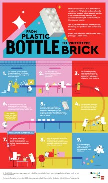 LEGO has revealed a prototype LEGO brick made from recycled PET plastic bottles. The prototype, which took three years and more than 250 variations to develop, also uses strengthening additives, which help the bricks meet LEGO’s safety, play, and clutch-power requirements. A 1-liter PET bottle provides enough raw material to make approximately 10 LEGO 2×4 bricks. The plastic is sourced from suppliers that use U.S. Food & Drug Administration– and European Food Safety Authority–approved processes to ensure quality. [LEGO]